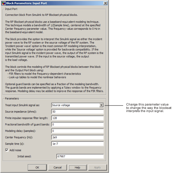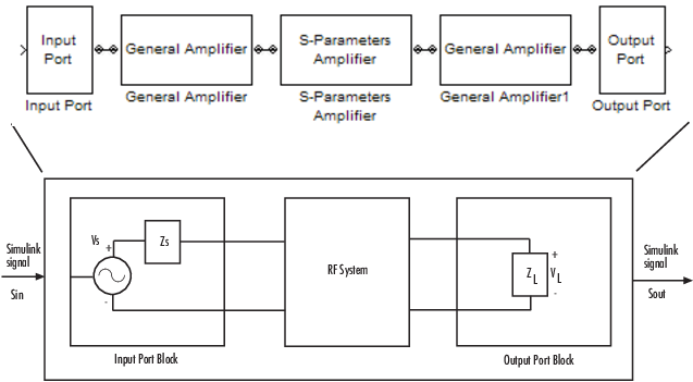 Блоксеть предоставляет возможность интерпретировать входной сигнал Simulink, Sin, как напряжение источника, VS, ВЧ-системы. На следующем рисунке показана модель для этой интерпретации.