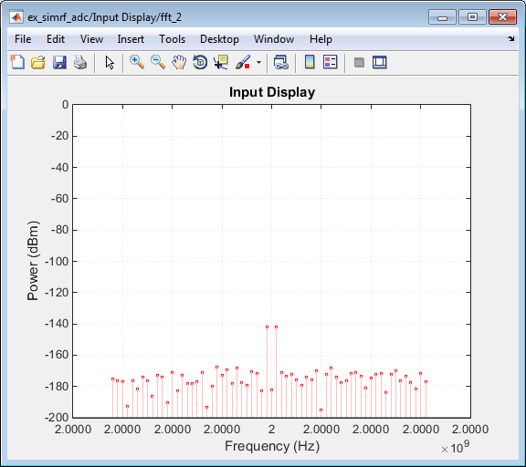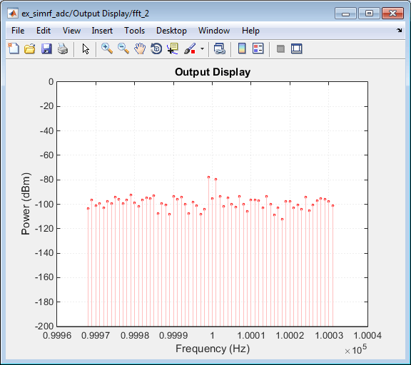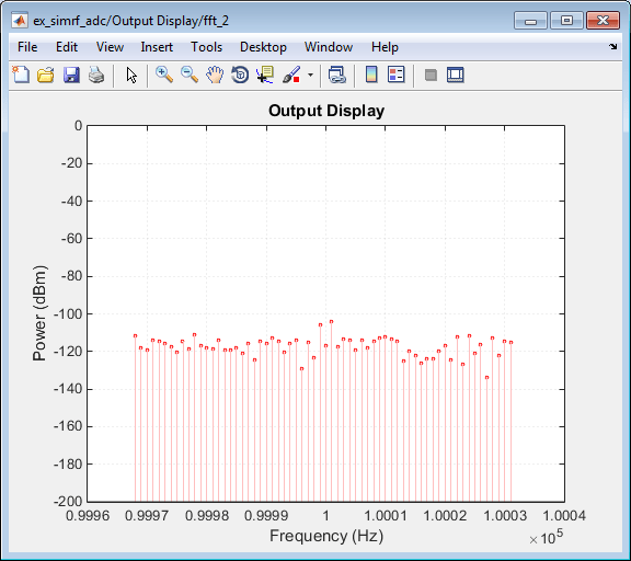 Модель ex_simrf_adc моделирует приемник с низким ПЧ с АЦП. Эта модель основана на модели ex_simrf_snr описано в разделе Создание модели приемника с низким ПЧ. На выходе радиочастотной системы подсистема АЦП моделирует АЦП с диапазоном FS sqrt(100e-3) V и разрешение 16 бит.