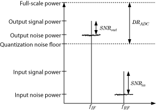 На предыдущем рисунке показан радиочастотный сигнал, который попадает в динамический диапазон (DR) АЦП. Входной сигнал и шум на несущей fRF имеют высокое отношение сигнал/шум (SNR). Принятый сигнал на fIF уменьшил SNR из-за показателя шума системы. Однако, если ошибка квантования близка к шуму приемника или превышает его, производительность системы ухудшается.