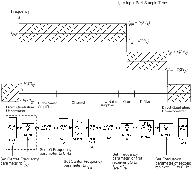 Программное обеспечение RF Blockset™ Equivalent Baseband использует эквивалентную модель основной полосы для моделирования компонентов RF во временной области. Блоксеть моделирует только полосу частот вокруг несущей частоты каждого компонента; полоса частот определяется следующими параметрами соответствующего блока «Входной порт»: