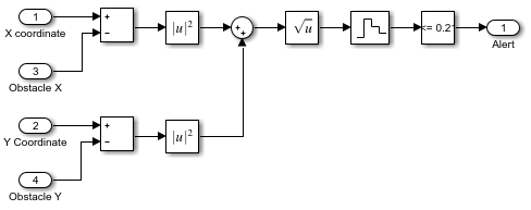 Создайте подсистему измерения расстояния. В блоке модели сенсора используйте функцию Вычитание, Математическая функция с функцией magnitude^2, Суммировать и блоки Sqrt, как показано на рисунке. Обратите внимание на изменение порядка входных портов.