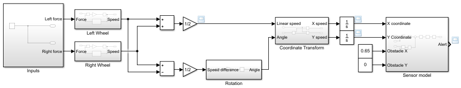 Модель представляет собой плоского робота, который может двигаться или вращаться с помощью двух колёс, аналогично домашнему вакуумирующему роботу. Откройте модель, введя в командной строке MATLAB ®: