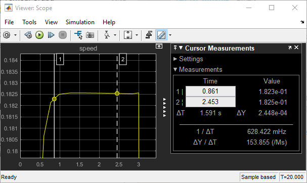 Увеличьте масштаб стабильной области выходного сигнала скорости во времени от 1 с до 3 с.