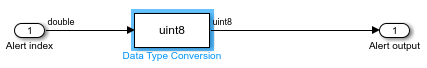 Компонент устройства оповещения преобразует Alert index сигнал от двойника до целого числа. Можно задать тип данных в источниках или использовать блок преобразования типов данных из библиотеки атрибутов сигнала. Тип данных Double по умолчанию обеспечивает наилучшую числовую точность и поддерживается во всех блоках. Двойной тип данных также использует большую часть памяти и вычислительной мощности. Другие числовые типы данных могут использоваться для моделирования встраиваемых систем, в которых память и вычислительная мощность ограничены.