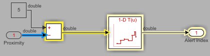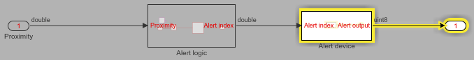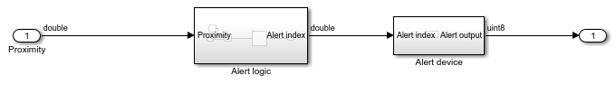Модель отображает типы данных вдоль сигнальных линий. Большинство сигналов являются двойными, за исключением выходного сигнала системы оповещения. Дважды щелкните подсистему для исследования.