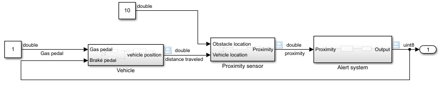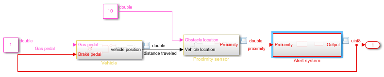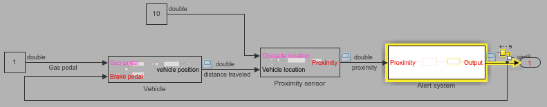 При построении модели блоки соединяются вместе со сложными компонентами модели, представляющими динамику системы. В этой модели система Vehicle, Proximity sensor и Alert представляют собой сложные компоненты с несколькими блоками, которые существуют в иерархии подсистем. Для просмотра содержимого подсистемы дважды щелкните ее.