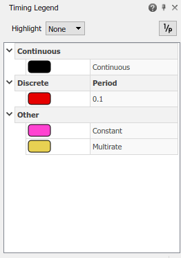 Дискретный блок или сигнал, который обновляется с наименьшим фиксированным интервалом, имеет красный цвет. Сигналы с дискретной выборкой времени обновляются с фиксированным интервалом. Если модель содержит компоненты с различным фиксированным временем выборки, каждое дискретное время выборки имеет различный цвет.