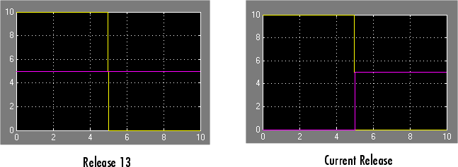 Обратите внимание на то, что исходные выходные данные запускаемой подсистемы различаются между двумя версиями. Это происходит потому, что версия 13 и более ранние версии используют начальный выход блока, подключенного к выходному порту (т.е. блок константы), в качестве начального выхода запускаемой подсистемы. Напротив, выходные данные этой версии 0 в качестве начального выходного сигнала запускаемой подсистемы, поскольку в модели не указан начальный выходной сигнал порта.