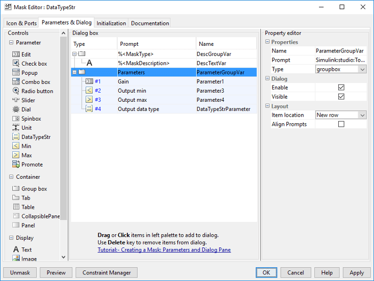Откройте модель, в которой требуется замаскировать блок. Например, откройте DataTypeStr модель в разделе Параметры маски (Mask Parameters).