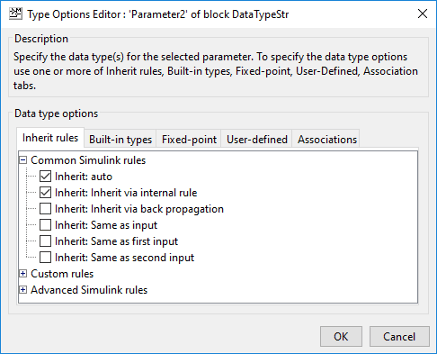 Правила наследования (Inherit rules) - укажите правила наследования для определения типов данных. Правила наследования сгруппированы по трем категориям: Общие правила Simulink, Пользовательские правила и Расширенные правила Simulink. По умолчанию общие правила Simulink и расширенные правила Simulink доступны на вкладке Наследовать правила. Раздел Расширенные правила позволяет наследовать правила из данных точек останова, постоянного значения, коэффициента усиления, табличных данных, логических данных, накопителя, выходных данных продукта и Simulink. Он также позволяет иметь ту же длину слова, что и входные, и одинаковые типы данных для всех портов. Пользовательские правила перечислены на вкладке Наследовать правила (Inherit rules), только если в пути поиска MATLAB зарегистрированы какие-либо пользовательские правила наследования. Определения некоторых правил наследования см. в разделе Правила наследования типов данных.