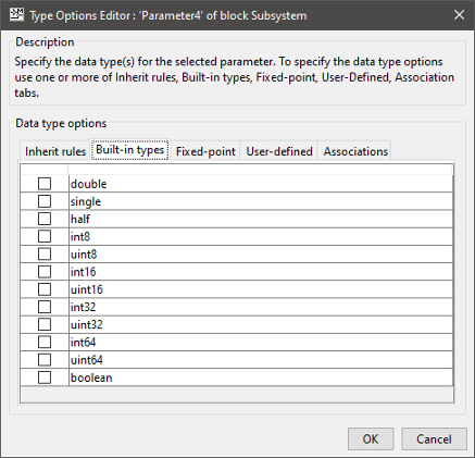 Встроенные типы: Укажите один или несколько встроенных типов данных Simulink ®, например double или single. Дополнительные сведения см. в разделе Типы данных, поддерживаемые Simulink.