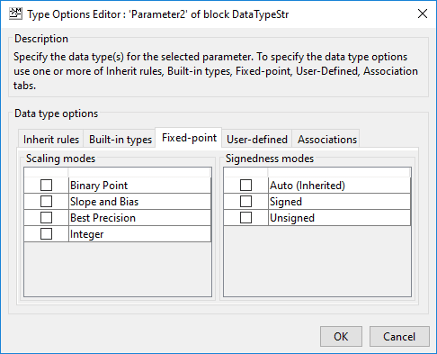 Фиксированная точка: Укажите режимы масштабирования и подписи для типа данных с фиксированной точкой. Дополнительные сведения см. в разделе Указание типа данных с фиксированной точкой.