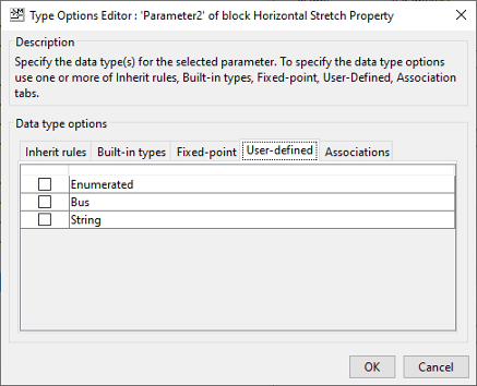 Определяемый пользователем: Укажите объект шины, перечисляемый (перечисляемый) тип данных или строку. Дополнительные сведения см. в разделах Указание перечисляемого типа данных, Указание типа данных объекта шины и Строки симулятора.
