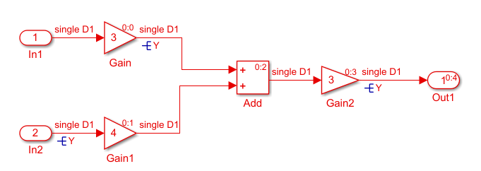 Например, в этой модели генератор кода не может повторно использовать переменную Y для удержания выходов In2, Gain, и Gain2 потому что Gain выполняется до Gain2. Созданный код содержит дополнительную переменную для хранения Gain выход. Красные цифры в верхнем правом углу блоков указывают порядок выполнения.