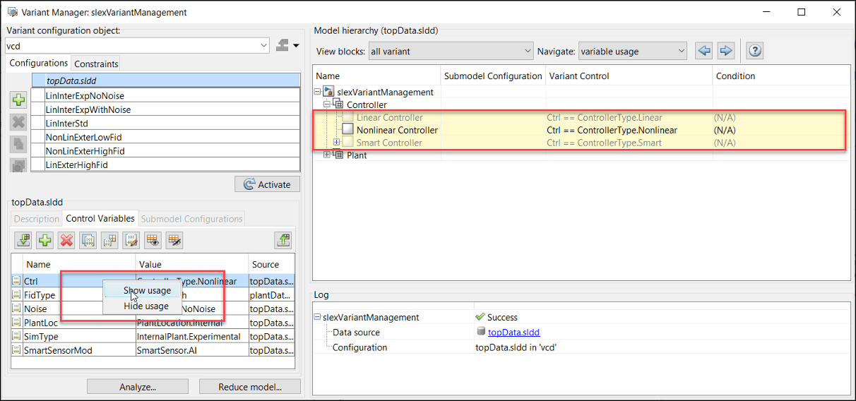 Для этого в окне Диспетчер исполнения (Variant Manager) щелкните правой кнопкой мыши требуемую управляющую переменную и выберите Показать использование (Show usage) или Скрыть использование (Hide usage). Пример скриншота показан на рисунке.