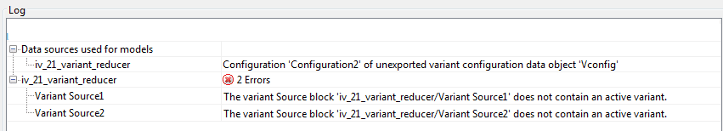 На панели Журнал (Log) отображаются информация и результаты проверки источника управляющих переменных для моделей в иерархии.