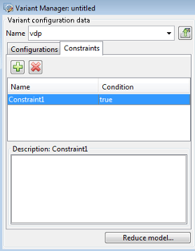 На верхней панели отображается имя и состояние ограничений, а на нижней панели - описание. Выражение условия ограничения должно удовлетворяться всеми конфигурациями исполнения в модели.