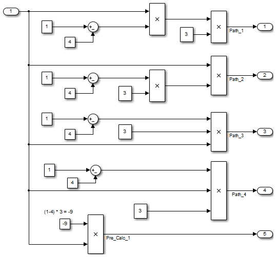 Path_1 = InputSignal * -3.0 * 3.0; /* Product: '<Root>/Product4' incorporates: * Inport: '<Root>/In1' */ Path_2 = InputSignal * -9.0; /* Product: '<Root>/Product2' incorporates: * Constant: '<Root>/Constant2' * Inport: '<Root>/In1' */ Path_3 = -9.0 * InputSignal; /* Product: '<Root>/Product5' incorporates: * Constant: '<Root>/Constant2' * Inport: '<Root>/In1' */ Path_4 = -3.0 * InputSignal * 3.0; /* Product: '<Root>/Product6' incorporates: * Constant: '<Root>/Constant3' * Inport: '<Root>/In1' */ Pre_Calc_1 = -9.0 * InputSignal; Чтобы максимизировать автоматический предварительный расчет, добавьте сигналы в конце набора уравнений. Встроенные данные сокращают возможность настройки параметров модели. Для выполнения калибровки необходимо определить параметры, требующие калибровки. Дополнительные сведения см. в разделе Создание настраиваемого параметра калибровки в сгенерированном коде (Simulink Coder). | |