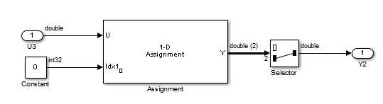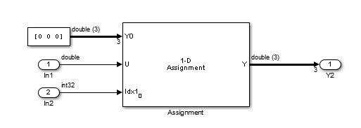 | Примечания | Если выходной вектор блока Assignment не инициализирован с вводом в блок, элементы вектора могут не быть инициализированы в сгенерированном коде. Если блок Assignment используется итеративно и все поля массива назначаются в течение одного шага времени моделирования, ввод инициализации в блок не требуется. Доступ к неинициализированным элементам блочного вывода может привести к непредвиденному поведению. |