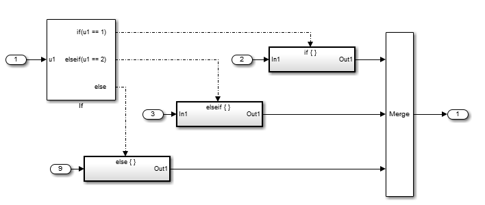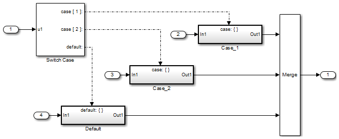 | Примечания | Комбинация блоков Switch Case и If Action Subsystem обеспечивает условное выполнение на основе входных условий. Укажите путь выполнения по умолчанию в виде блока «Default». | ||