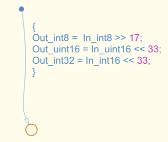 Правильный Когда операции сдвига превышают ширину входных сигналов, выполните явное преобразование. Поскольку выходной сигнал может содержать конечное значение, преобразование предотвращает запись выходного сигнала как 0 во время генерации кода.