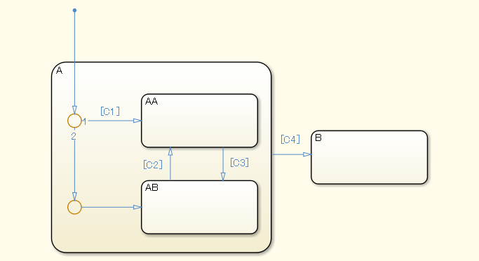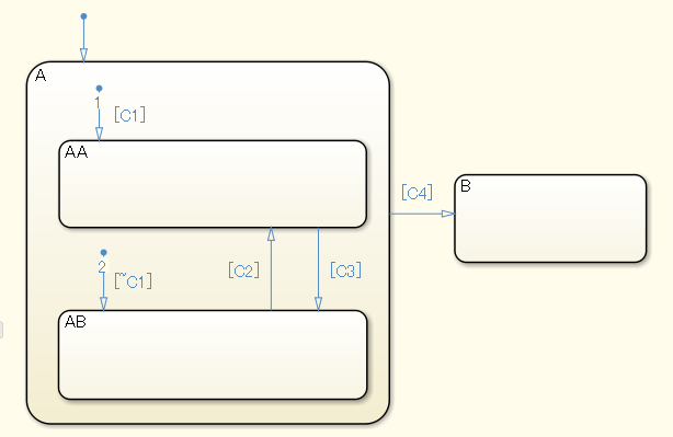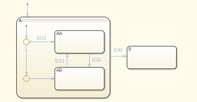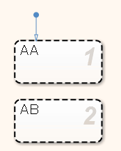 Разложение родительского объекта для состояний AA и AB имеет значение Parallel (AND), что делает состояния AA и AB параллельными состояниями. Линия перехода по умолчанию не подключена для этих параллельных состояний.