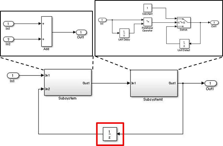 Блок задержки находится в иерархии, которая описывает цикл обратной связи.