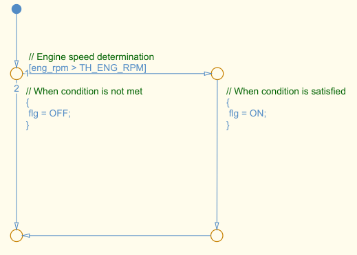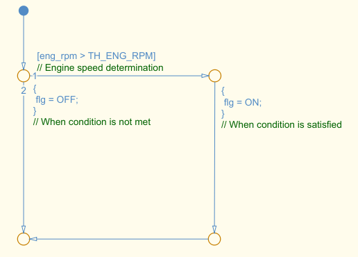 Комментарии в метках перехода должны располагаться над условиями перехода, действиями условий, действиями перехода и событиями Stateflow.