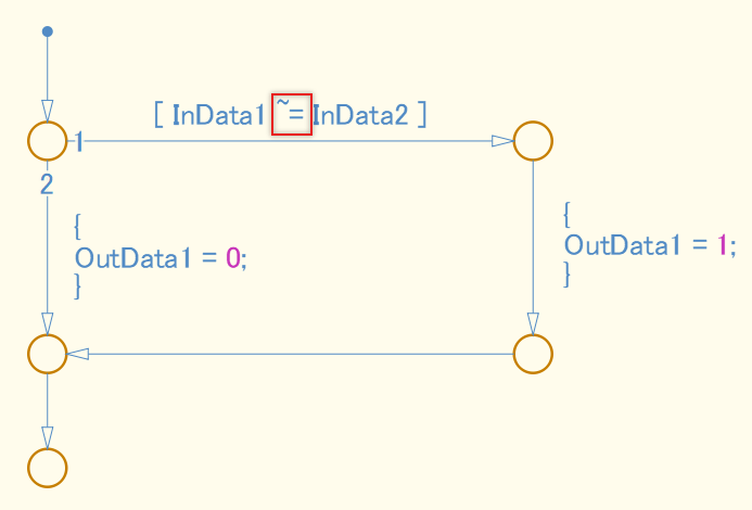 Если для свойства Stateflow Chart (Stateflow) для параметра Action Language установлено значение C, оператор ~= используется для операций с неравенством.