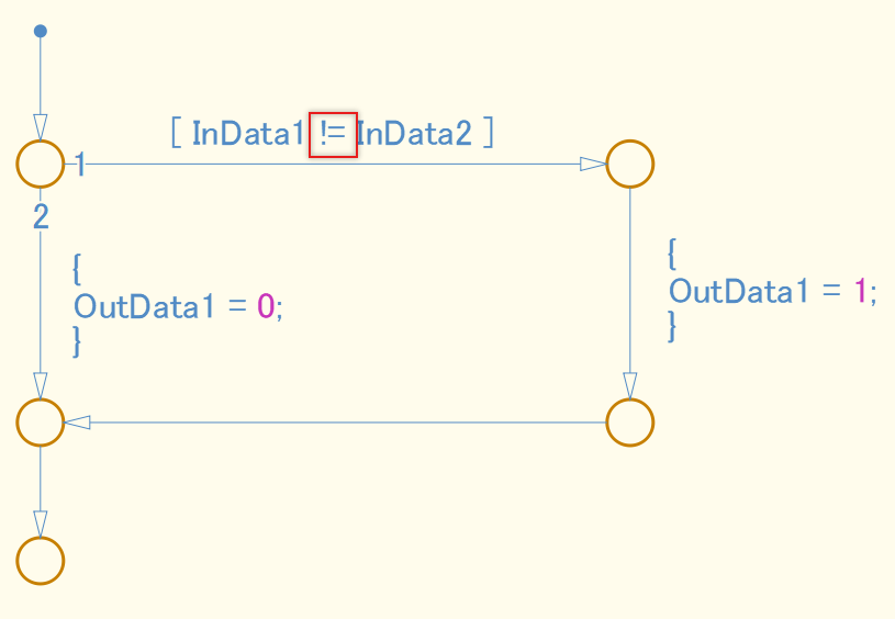 Если для свойства Stateflow Chart (Stateflow) для параметра Action Language установлено значение C, оператор != используется для операций с неравенством.