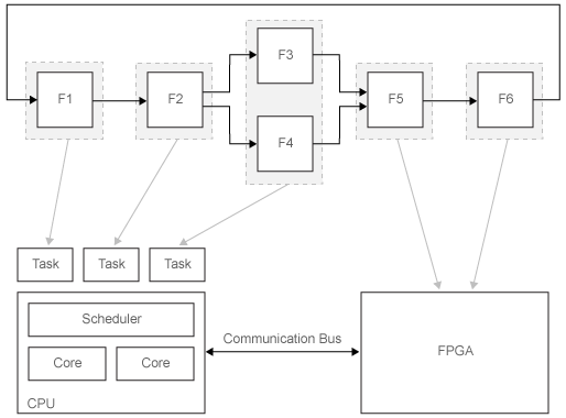 На рисунке показан пример системы с несколькими функциями, предназначенными для выполнения в многопроцессорной системе на базе CPU и FPGA. Система разделена на несколько компонентов, которые сопоставлены планировщику задач CPU или FPGA.