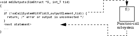 На этом рисунке ssCallSystemWithTid выполняет подсистему функционального вызова, которая подключена к первому элементу выходного порта. ssCallSystemWithTid возвращает 0, если ошибка возникает при выполнении подсистемы вызова функции или если выход не подключен. После выполнения подсистемы вызова функции управление возвращается к S-функции.