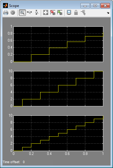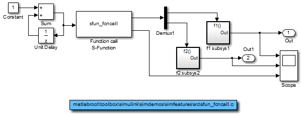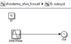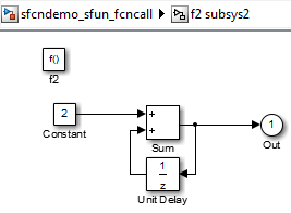 Первая подсистема вызова функций обеспечивает синусоидальный выход. Вторая подсистема функционального вызова представляет собой простой контур обратной связи, содержащий блок единичной задержки.