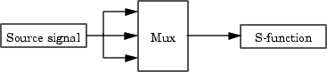 Для проверки правильности доступа S-функции к широким входным сигналам передайте реплицированный сигнал на каждый входной порт S-функции. Для этого создайте Mux-блок с количеством входных портов, равным ширине требуемого сигнала, входящего в вашу S-функцию. Затем подключите источник возбуждения к каждому входному порту S-функции, как показано на следующем рисунке. Наконец, запустите S-функцию, используя этот входной сигнал, чтобы убедиться, что она не потерпит крах и не даст ожидаемых результатов.