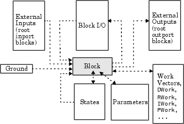 S-функциональные блоки имеют входные и выходные сигналы, параметры и внутренние состояния, а также другие общие рабочие области. В общем случае входы и выходы блоков записываются в вектор ввода-вывода блока и считываются из него. Входные данные также могут поступать из