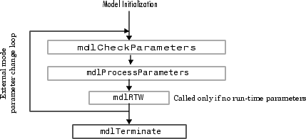 Механизм вызывает mdlRTW один раз при входе во внешний режим и снова при каждом изменении параметра или при нажатии кнопки Обновить модель (Update Model) на вкладке Моделирование (Modeling).