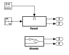 Модель содержит две невиртуальные подсистемы, условно выполненную разрешенную подсистему Reset и атомарную подсистему Atomic. Каждая подсистема содержит S-функциональный блок, вызывающий S-функцию. dsfunc.c, которая моделирует дискретную пространственно-государственную систему с двумя состояниями. Включенная подсистема Reset сбрасывает значения состояния, когда подсистема включена, и выходные значения, когда подсистема отключена.