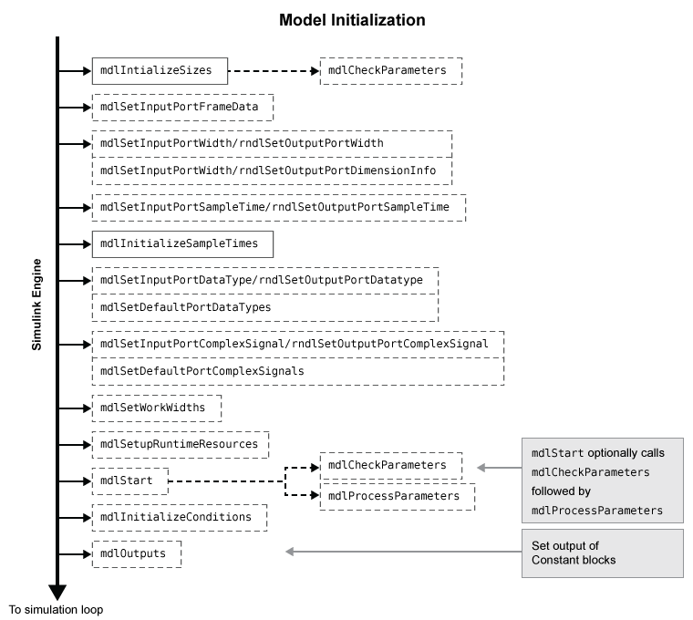 На следующих рисунках показан порядок, в котором механизм Simulink вызывает методы обратного вызова в S-функции. Сплошные прямоугольники указывают обратные вызовы, которые всегда происходят во время инициализации модели или на каждом шаге времени. Пунктирные прямоугольники указывают обратные вызовы, которые могут происходить во время инициализации и/или на некоторых или всех временных шагах во время цикла моделирования. Обратитесь к документации по каждому методу обратного вызова, чтобы определить точные обстоятельства, при которых модуль вызывает обратный вызов.