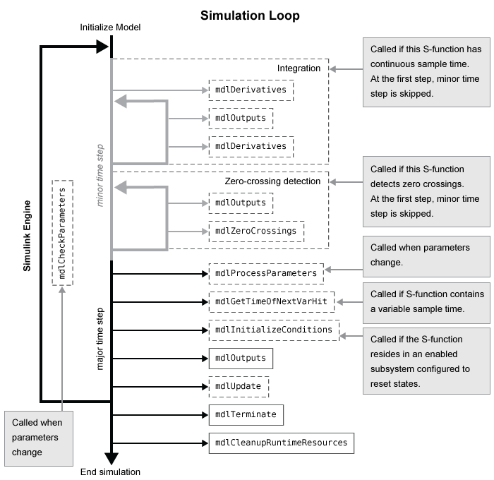 После инициализации модуль Simulink выполняет следующий цикл моделирования. Если цикл моделирования прерывается вручную или при возникновении ошибки, механизм переходит непосредственно к mdlTerminate способ. Если моделирование было остановлено вручную, модуль сначала завершает текущий временной шаг перед вызовом mdlTerminate.