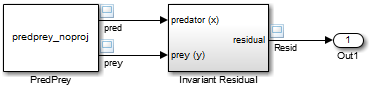 Блок Инвариантный остаток (Invariant Resident) в этой модели вычисляет остаток между инвариантной функцией, оцениваемой вдоль идеальной траектории системы через пространство состояний, и ее моделируемой траекторией:
