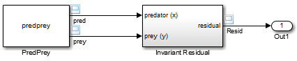Эта модель аналогична предыдущей, за исключением ее S-функции, predprey.m, включает mdlProjection метод, который использует подход возмущений, описанный в разделе Возмущение состояний системы с использованием инварианта решения для компенсации численного дрейфа. В результате численное решение более точно отслеживает идеальное решение по мере продвижения моделирования, как показано остаточным сигналом, который остается близким или равным нулю на протяжении всего моделирования: