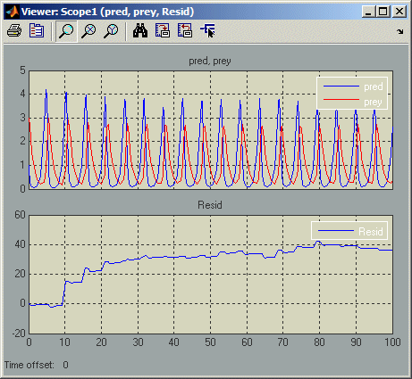 где xnand ynare значения, вычисленные решателем модели для плотности популяции хищника и добычи, соответственно, на текущем шаге времени. В идеале остаток должен быть равен нулю на протяжении всего моделирования модели, но моделирование модели показывает, что остаток на самом деле значительно отклоняется от нуля: