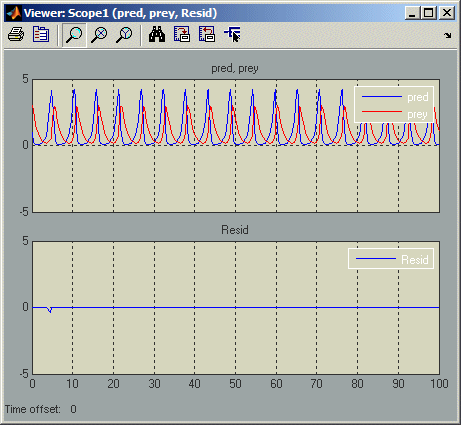 Блок PredPrey ссылается на S-функцию, predprey_noproj.m, который использует уравнения Лотка-Вольтерра