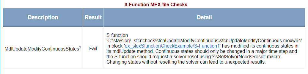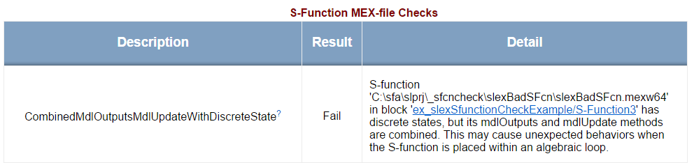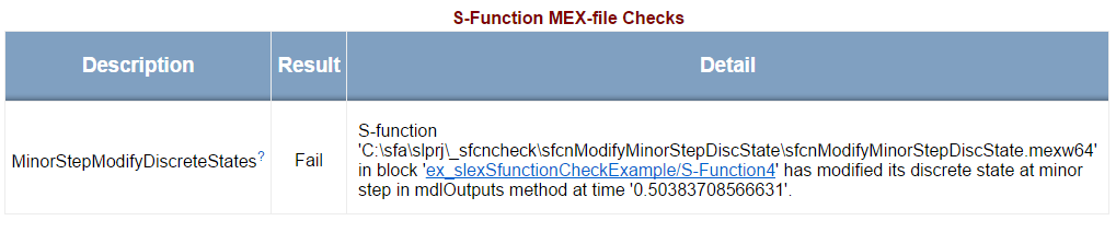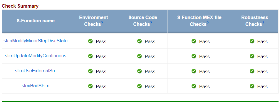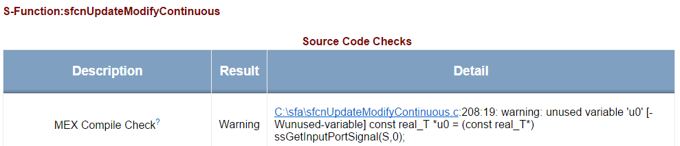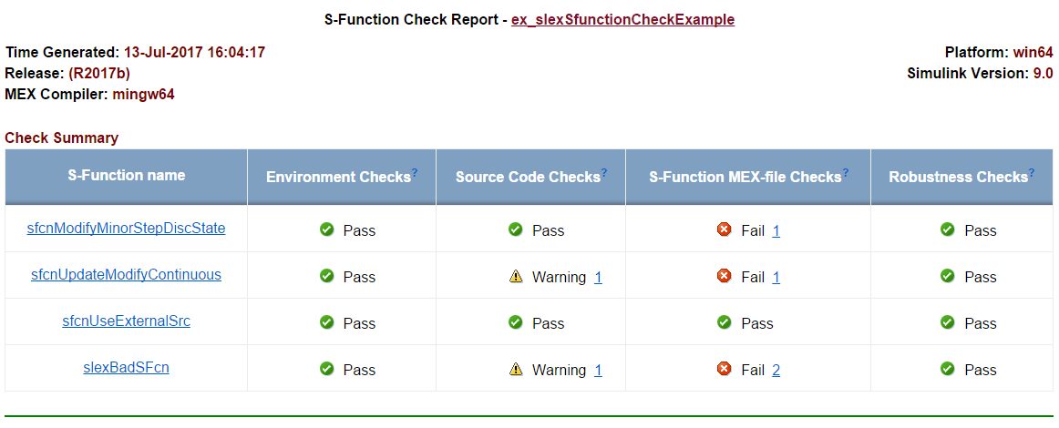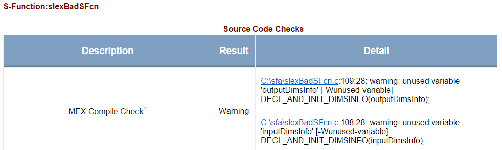 Пример модели имеет два предупреждения в Source Code Checks и четыре вопроса, касающиеся S-function MEX-file checks. В целом, предупреждения не так значимы, как неудачи, но они являются хорошими источниками для получения дополнительной информации о ваших S-функциях.