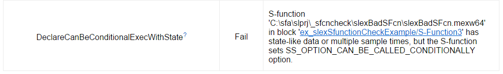 Код описания DeclareCanBeConditionalExecWithState указывает, что у вас есть данные, похожие на данные о состоянии, или если вы используете несколько образцов в модели, вы не можете использовать SS_OPTION_CAN_BE_CALLED_CONDITIONALLY в исходном коде S-функции.