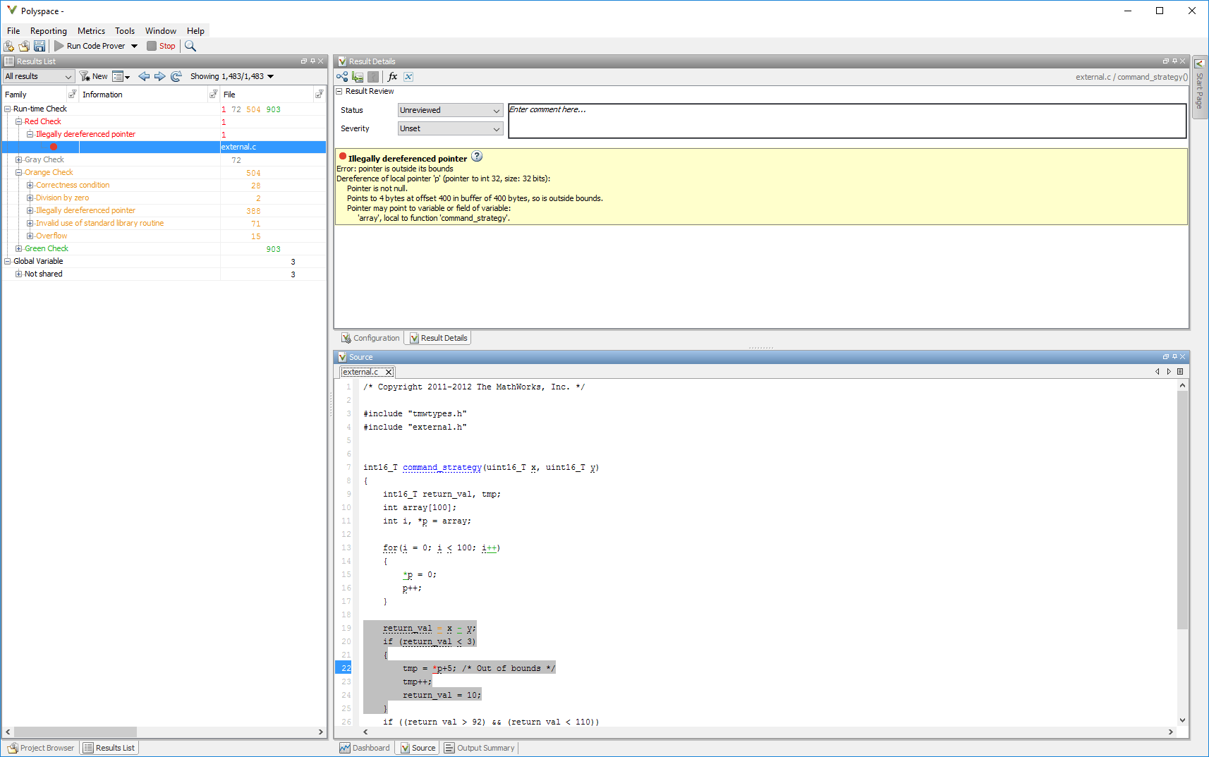 S-function analyzer позволяет выполнять проверку кода в программе Polyspace Code Prover. Чтобы включить проверку, в объекте Simulink.sfunction.analyzer.Options задайте EnablePolyspace на 1. Программа Polyspace Code Prover делит чеки на красные, зеленые, оранжевые и серые. Дополнительные сведения о типах проверок см. в разделах Результат проверки кода и Цвета исходного кода (Проверка кода в пространстве).