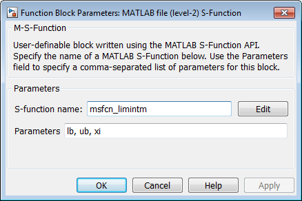 Модель msfcndemo_limintm в этом примере включает выборку S-функции msfcn_limintm.m.