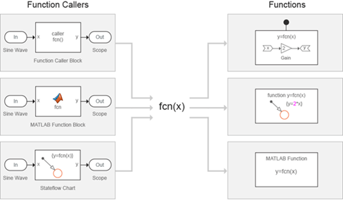 Функции в модели Simulink, которые совместно используют общий текстовый интерфейс с вызывающими функциями.