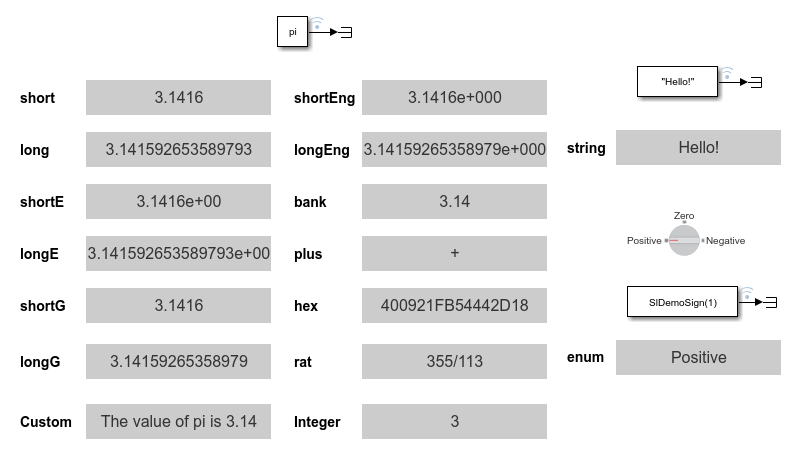Блок отображения подключается к сигналу в модели и отображает его значение во время моделирования. Внешний вид и формат блока «Отображение» можно настроить таким образом, чтобы он имел интуитивно понятное значение. Параметры блока отображения можно редактировать во время моделирования. Блок отображения может отображать сложные, векторные и 2-D матричные сигналы. Используйте блок «Отображение» (Display) с другими блоками панели инструментов, чтобы создать интерактивную панель инструментов из элементов управления и индикаторов для модели.