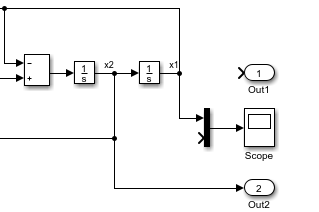 open_system('vdp');Удалите строку из x1 в блок Out1. Эта команда удаляет только сегмент линии, соединяющей ветвь с указанным блоком.